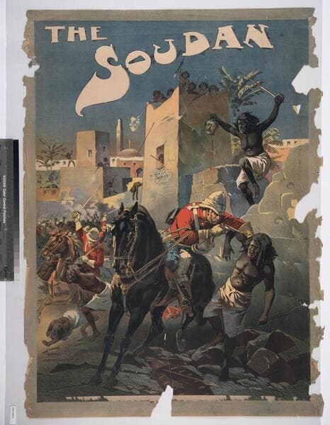 Image of an Arab soldier on a rearing horse riding through the desert with an army of soldiers in the background; the poster advertises the melodrama "The Soudan," first performed in England under the title "Human Nature."