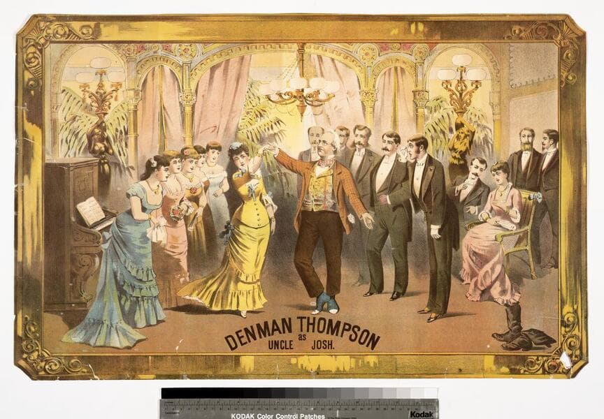 Image of a central image of an older African American man in a torn shirt and suspenders kneeling before Abraham Lincoln who holds a handwritten copy of the “Emancipation Proclamation” with broken shackles at his feet, captioned “Abolition of Slavery”; with an upper-left image of Eliza, a young mother, and a young girl coming to Uncle Tom and his wife, who holds a candle, in their pajamas before their cabin at night, captioned “Eliza seeking protection of Uncle Tom”; a lower-left image of Eva, a young blond girl lying in a small bed with white and African American mourners crowding around the bed and a night stand with a cup, small bottle, and box on it, captioned “Death of Eva”;an upper-right image of an African American man and woman dancing in the front yard of a cabin in a wooded area with African American onlookers and a man playing a banjo, captioned “Pastimes in the sunny South”; a lower-right image of Topsy, a young African American girl wearing a potato sack dress that read “18 [space] CH,” throwing a bonnet while sitting on a messy floor next to a can while a white woman in formal dress looks on aghast; the poster presumably advertises an Uncle Tom’s Cabin show.