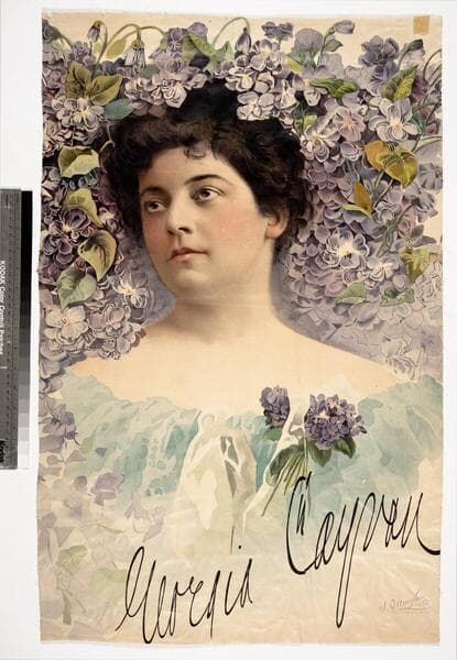 Image of a head-and-shoulders portrait of opéra bouffe actor and singer Louise Theo in a lace-fringed dress and hat in a circular border decorated with flowers and leaves.
