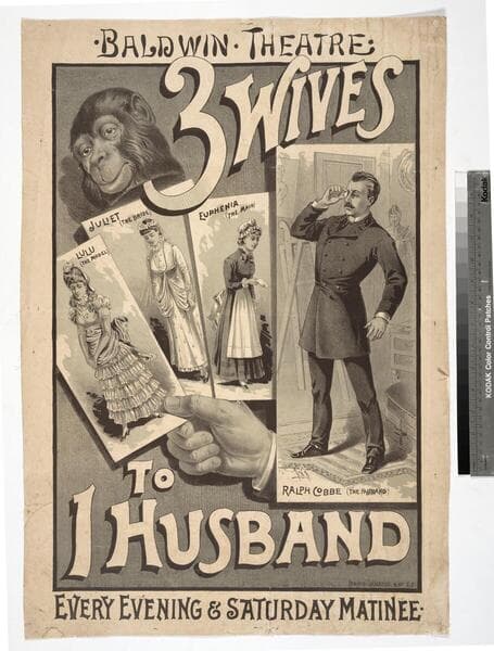 Image of a woman with her hands clasped pleading with two men in suits, the man at center is dressed with a top hat, cane, and monocle; the poster advertises the comedy "Nancy and Company" adapted by John Augustin Daly from “Halbe Dichter” by Julius Rosen.