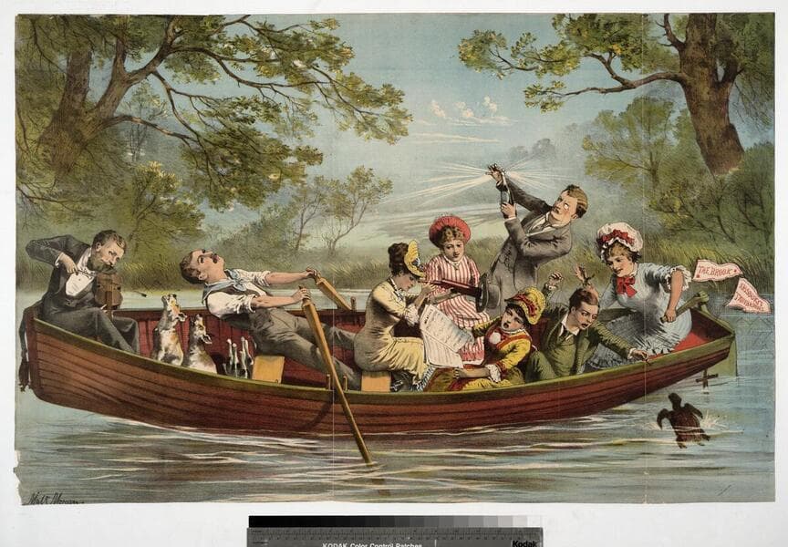 Image of six head-and-shoulders portraits of the two female and four male members of the comic troupe Salsbury's Troubadours wearing formal dress, in oval frames surrounded by plants, a crane, a turtle, and two anthropomorphized singing frogs; the portraits are unlabeled but presumably include troupe members Nate Salsbury, Nellie McHenry, and John L. Webster.
