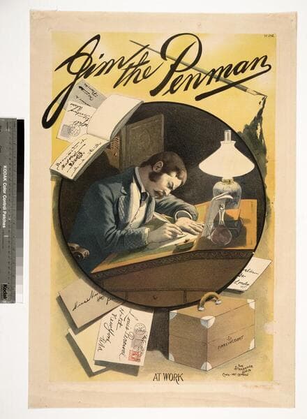 Image of a man sitting in a chair in a study with a woman showing him a letter; the poster advertises the melodrama "Jim the Penman" written by Charles Young.