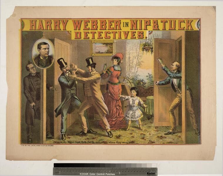 Image of two men racing carts driven by snorting horses down a crowded city street and being chased by a police officer with angry pedestrians, a dog, and storefronts in the background; vignette of a head-and-shoulders portrait of comedian and actor Harry Webber in forma dress at upper left; unfinished title panel has horseshoe decoration; the poster advertises the melodrama comedy "Nip and Tuck: or, the Great Detectives."