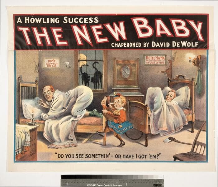 Image of the legs of three men, apparently disconnected from the top halves of their bodies, floating out open windows from a room containing a vase with palm fronds and a chair; the poster advertises the comedy "The New Baby" adapted by English actor and stage manager Arthur Bourchier from the German play "Der Rabenvater" by H. Fischer and Joseph Jarn.