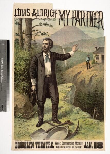 Image of a head-and-shoulders portrait of American actor Louis Aldrich, wearing formal dress, in an oval decorated with United States flags, eagle, leaves, acorns, and branches, and a shield; date sheet for performances beginning on December 13, [1886], at the Grand Opera House in Brooklyn, New York, pasted at bottom of image; the poster advertises Aldrich presumably in the drama "My Partner" by Bartley Campbell.