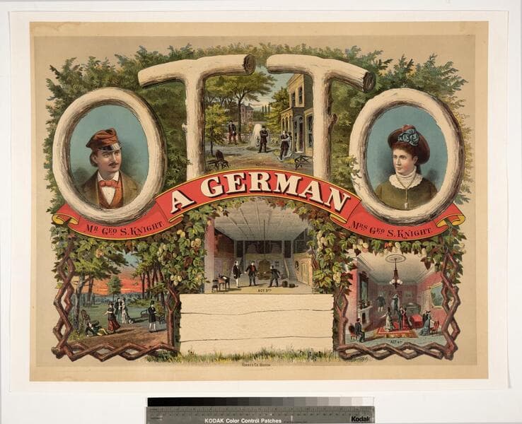 Image of an outdoor courtyard with two servants and a man pushing two baby carriages and holding crying babies while onlookers watch; with vignettes of head-and-shoulder portraits of German comedian George S. Knight and his wife, American burlesque performer Sophie Worrell Knight, at bottom center; fragment of a date sheet for the Fulton Opera House in Lancaster, Pennsylvania, pasted at bottom; the poster advertises the musical and burlesque show "Over the Garden Wall" by Scott Marble that was produced by the Knights.