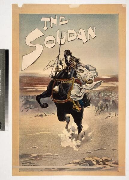 Image of a battle scene with Sudanese soldiers wearing turbans on horseback with spears and swords fighting Arab soldiers on foot with rifles; the poster advertises the melodrama "The Soudan," first performed in England under the title "Human Nature."