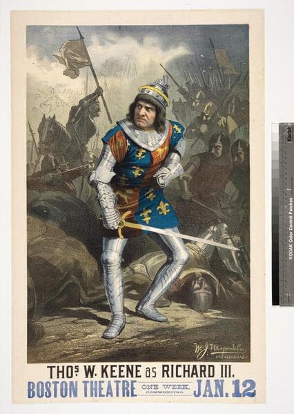 Image of a head-and-shoulders portrait of American actor Richard Foote in formal dress reflected in a hand-held mirror oval with flowers; the poster advertises the tragedy "Richard III" by William Shakespeare.