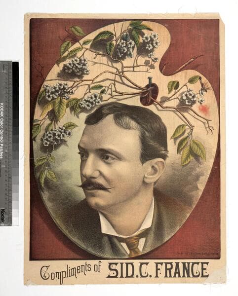 Image of a head-and-shoulders portrait of American actor Milton Nobles wearing formal dress, framed in a circle, and surrounded by legal books on a shelf with papers signed by Nobles with a quill pen and one book open and listing plays and dates including the play "Love and Law" written by Nobles in 1883.