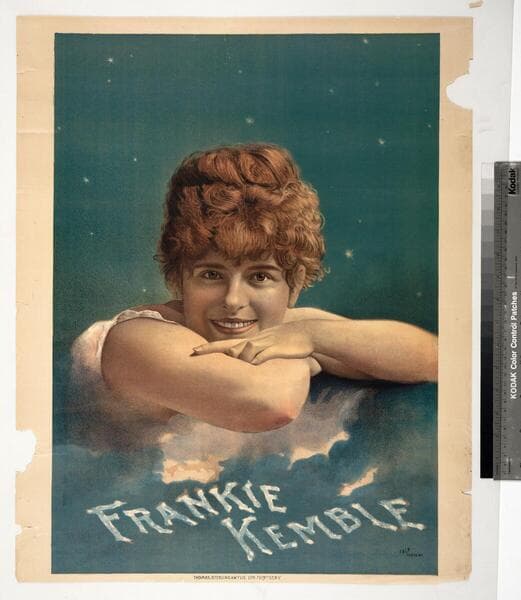 - Image of a head-and-shoulders portrait of actor Frankie Kemble in a sleeveless outfit with her arms crossed above the clouds with a starry night sky in the background.