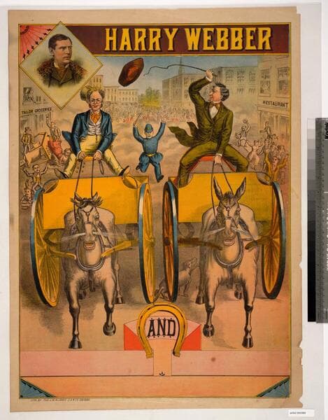 Image of a man running on foot while holding a piece of paper and chasing after a man on a galloping donkey; vignette of a head-and-shoulders portrait of comedian and actor Harry Webber in formal dress at upper left; the poster advertises the melodrama comedy "Nip and Tuck: or, the Great Detectives."