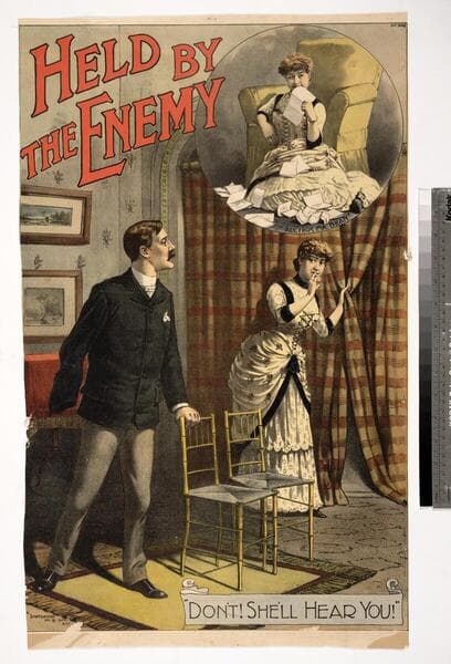 Image of a parlor with a young woman, portraying the character Laura Courtland, in a formal dress sitting in a chair holding an open book while a man, the character Ray Trafford, in a tuxedo stands behind, with a table, framed picture, vase and flowers, and curtains in the background; the poster advertises the melodrama "Under the Gaslight" by Augustin Daly.