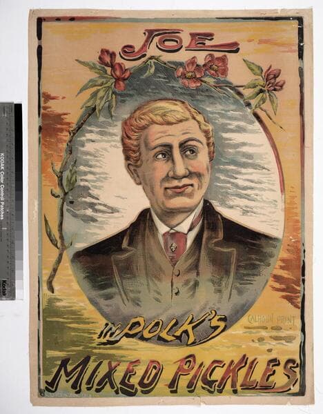 Image of a head-and-shoulders portrait of American comedian Charles B. Bishop in formal dress; border decorated with leaves, palm fronds, and comedy and tragedy masks; with date information for performances beginning on April 6, [1885], at the Baldwin Theatre in San Francisco, California, at top; the poster advertises the English farce comedy "Twins."