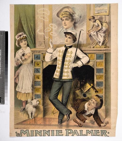 Image of a head-and-shoulders portrait of American actor Minnie Palmer wearing a hat and jewelry including a butterfly pin.