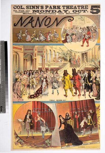 Image of French aristocratic men in historic costumes and long hair embracing women around the stone stairs of an abbey with nuns and soldiers with rifles in the background; the poster may advertise the comic opera "Nanon" set in Paris, France, during the reign of King Louis XIV, and originally written in German by librettist Camillo Walzel (under the pseudonym F. Zell) with a score by Richard Genee.