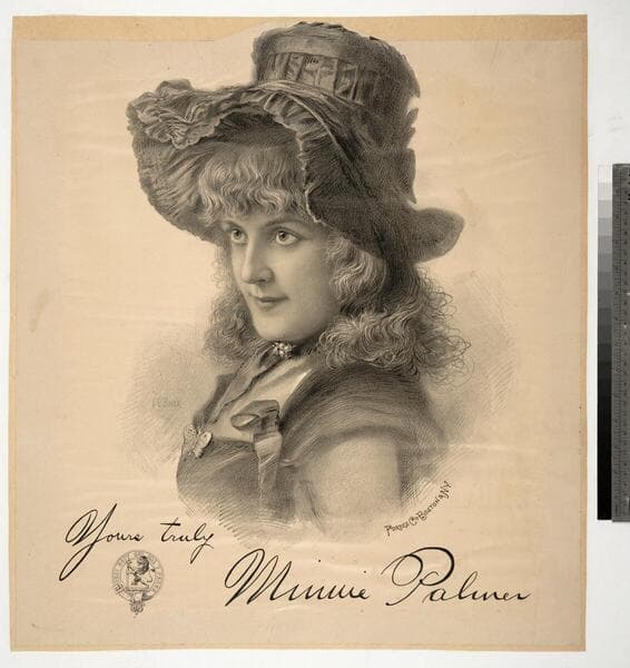 Image of a head-and-shoulders portrait of actor Minnie Wallace wearing a hat; with printed date information for performances beginning on August 23, [1886], at the Alcazar Theatre in San Francisco, California; the poster advertises the play "Oregon!" written by Joaquin Miller.