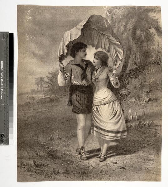 Image of a giant pepper tree dwarfing a couple strolling at left and a couple riding in a horse-drawn carriage at right; orange grove and mountains in background.
