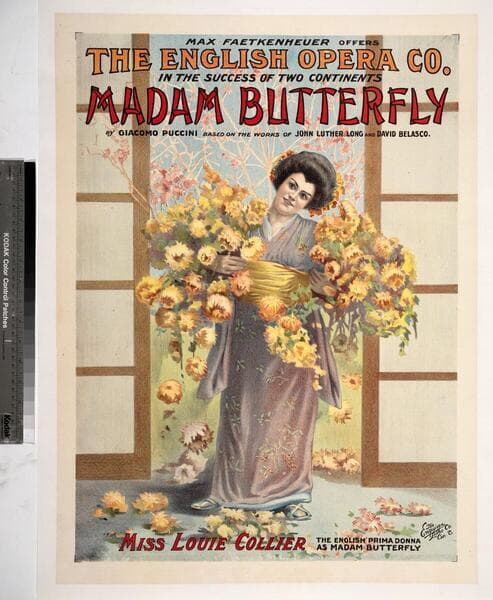 - Image of opera singer Louie Collier dressed in a traditional Japanese kimono and sandals holding two armfuls of flowers and standing in a screen doorway; the poster advertises the opera "Madam Butterfly" (also spelled "Madame Butterfly") written by Giacomo Puccini.