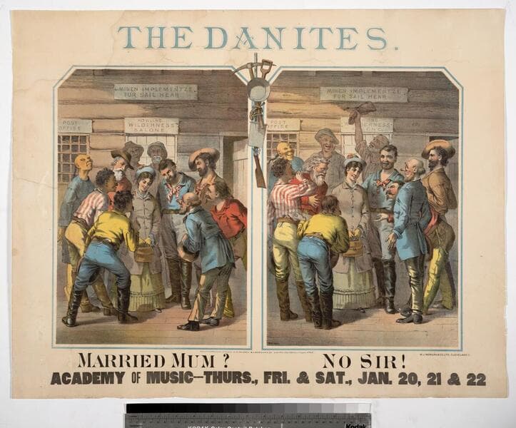 Image of two men wearing suits in a confrontation on a balcony; the poster advertises the melodrama "The Planter's Wife" by James K. Tillotson.