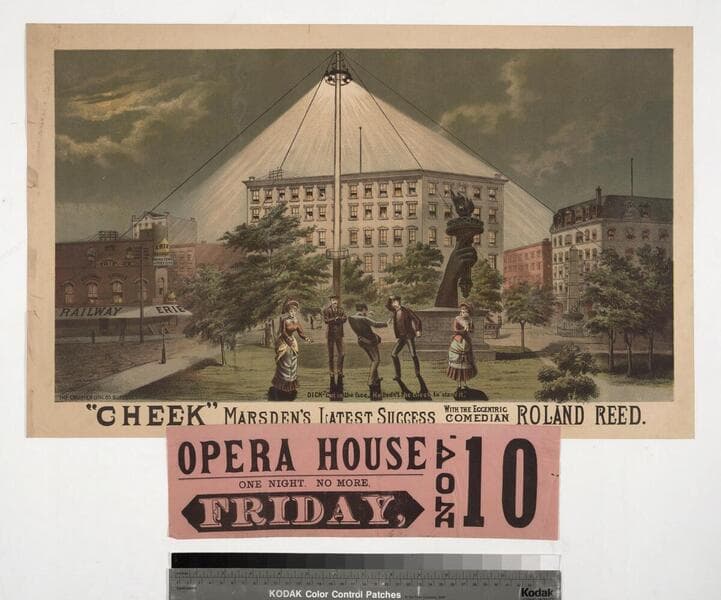 Image of a full-length portrait of comedian Roland Reed with vignettes of four scenes from the comedic melodrama "Cheek" by Frederick Mardsen, with captions of text between characters Ted and Dick and quotes from newspaper reviews of the play in the Chicago Times, Chicago Inter-Ocean, Chicago Daily News, the Chicago Herald, the St. Louis Republican, the St. Louis Post Dispatch, the Boston Herald, and the Boston Daily Globe; with date information for a show at the Worcester Theatre on November 7, [1883].