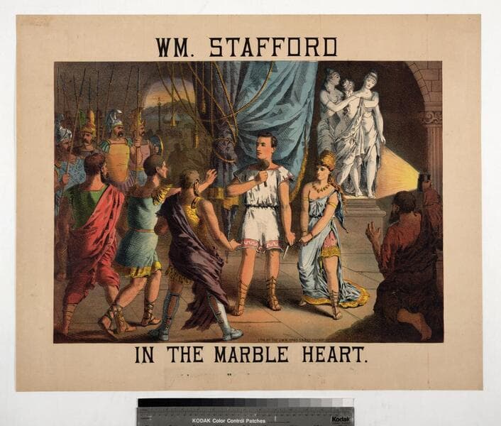Image of an outdoor courtyard with two servants and a man pushing two baby carriages and holding crying babies while onlookers watch; with vignettes of head-and-shoulder portraits of German comedian George S. Knight and his wife, American burlesque performer Sophie Worrell Knight, at bottom center; fragment of a date sheet for the Fulton Opera House in Lancaster, Pennsylvania, pasted at bottom; the poster advertises the musical and burlesque show "Over the Garden Wall" by Scott Marble that was produced by the Knights.