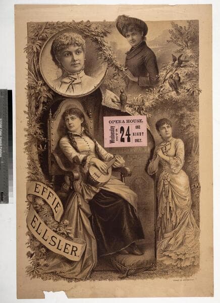 - Image of four portraits of American actor Effie Ellsler consisting of a full-length portrait of Ellsler sitting in a throne-like chair with her feet on a pillow playing a mandolin; a full-length portrait of Ellsler in a formal dress standing in a forested area with her hands clasped together; a head-and-shoulders portrait of Ellsler; and a half-length portrait of Ellsler outdoors wearing a coat, hat, and gloves, with birds sitting on tree limbs around her; with a date sheet for an October 24, [1883], performance, presumably of the melodrama Courage by A.C. Gunter at the Fulton Opera House in Lancaster, Pennsylvania.
