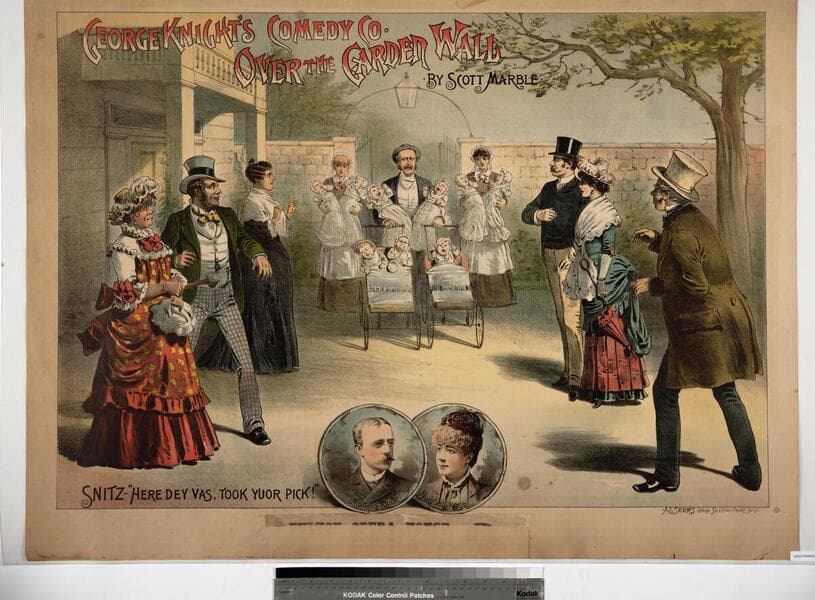 Image of circular vignettes of head-and-shoulders portraits of German comedian George S. Knight and his wife, American burlesque performer Sophie Worrell Knight, surrounded by tree, leaf, and fence borders, and four vignettes of scenes with a top center image of an outdoors view of a couple and two men in the front yard of a house with a fountain captioned "Act. 1st"; a bottom left image of an outdoor view of a park with a couple and a man on the ground having just been hit by a woman captioned "Act. 2nd."; a bottom center image of three men in a warehouse captioned "Act 3rd."; and a bottom right image of individuals in a formal parlor captioned "Act. 4th."; the poster advertises the comedic drama "Otto, a German" by Fred Mardsen.