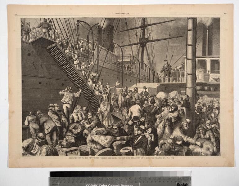 From the old to the new world--German emigrants for New York embarking on a Hamburg steamer
