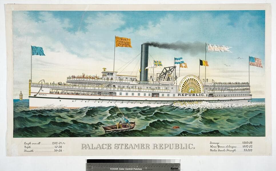 Image of the steamboat Grand Republic sailing with all three decks full of passengers; many pennants and flags visible on rigging, some lettered "Grand Republic" and "For Rockaway Beach."
