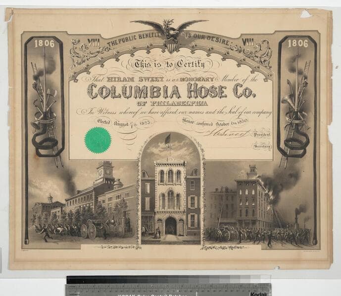 This is to certify that Hiram Sweet is an honorary member of the Columbia Hose Co. of Philadelphia