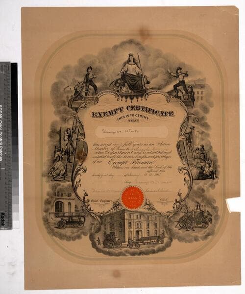 Exempt certificate. This is to certify that George H. Waite has served seven full years as an active member of Rescue Hook & Ladder Co. Watkins, NY Fire Department