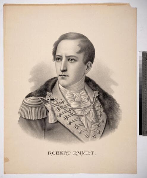 Image of a patriotic Irish message of protest against the British government; half-length portrait of Irish revolutionary Robert Emmet portrayed as a martyr with rays emanating from the portrait; large golden lyre with twining clover tipped with a pair of angels holding scrolls with the names of Irish patriots; heart at bottom center that reads "Liberty."