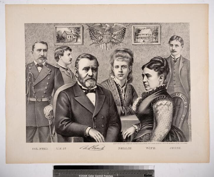 Image of a portrait of Union General Ulysses S. Grant and his family in a formal parlor with Grant and his wife Julia Dent Grant sitting in chairs, with a daughter and son sitting on a couch behind them with an open book, and two sons standing.