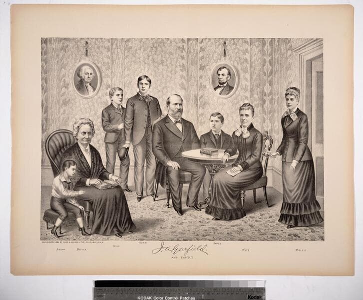 Image of a portrait of United States president James A. Garfield with his wife, sons, and daughters grouped around him in a well-appointed living room; portrait of Garfield's mother rests on table near him; paintings of Abraham Lincoln and the United States Capitol on the wall in background.