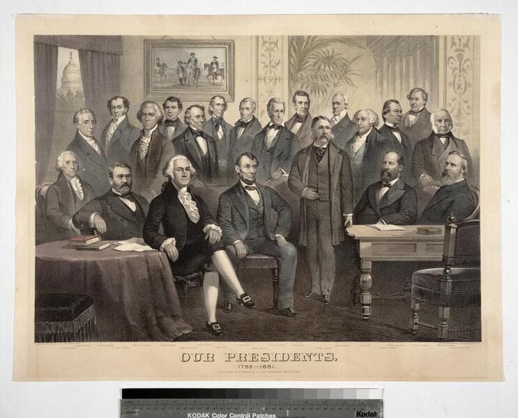 Image of a group of portraits of United States presidents until 1876 in celebration of the United States Centennial: George Washington, John Adams, Thomas Jefferson, James Madison, James Monroe, John Quincy Adams, Andrew Jackson, Martin Van Buren, William Henry Harrison, John Tyler, James K. Polk, Zachary Taylor, Millard Fillmore, Franklin Pierce, James Buchanan, Abraham Lincoln, Andrew Johnson, and Ulysses S. Grant; presentation of the Declaration of Independence to Congress at center; bald eagle with Union shield and American flags at top center.
