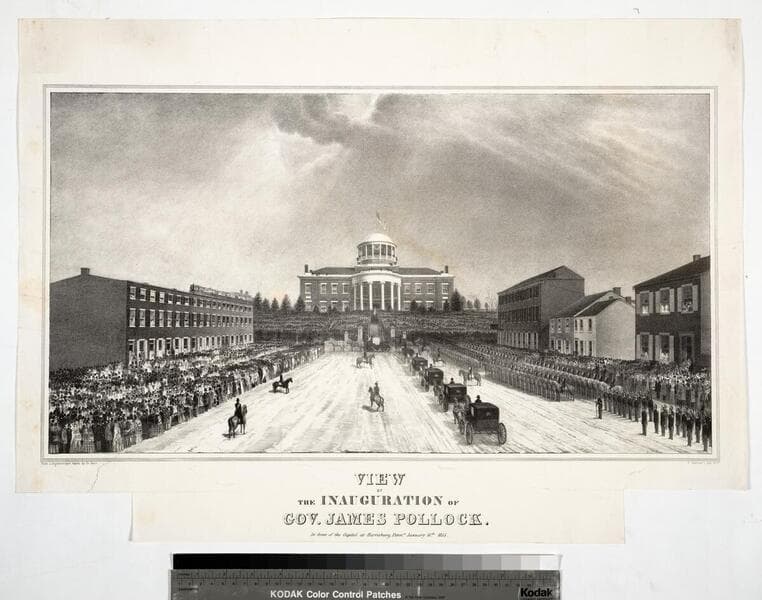 Image of an exterior view of the United States Capitol Building in Washington, D.C., during the 1881 inauguration of President James Garfield with a marching band proceeding up the steps to the Capitol's East Portico before rows of soldiers and crowds of spectators; the band is led by a banner labeled "Haverly's European Mastodon Minstrels."