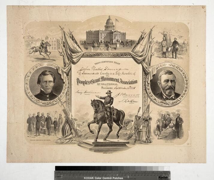 Image of a certificate memorializing a visit to the United States Centennial Exhibition in Philadelphia, Pennsylvania; image of four allegorical goddess figures reclining at center with symbols of American progress around and behind them, including a union shield, sheaves of grain, a plow and scythe, fruit, mechanical cogs, a caduceus, factories, and ships; images of the Main Building and Memorial Hall at top right and left corners; portraits of Presidents George Washington and Ulysses S. Grant flank the seal of the Centennial Certificate Bureau of Philadelphia, Pennsylvania, that depicts a bald eagle standing on a shield of stars and stripes; signatures of Pennsylvania governor John F. Hartranft, mayor of Philadelphia William S. Stokley, and President Ulysses S. Grant.