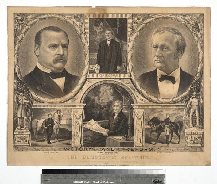 Image of a Democratic campaign poster for the presidential election of 1884; jugate pair of portraits of running mates Grover Cleveland and Thomas A. Hendricks framed by an angel, American flags, and the White House; portraits of prior United States presidents interspersed with information on presidential voting by year, on Cleveland and Hendricks, the Democratic platform, and state and territorial statistics.