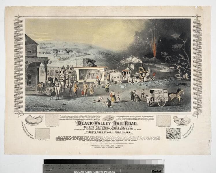 Image of a mock train schedule poster promoting temperance by warning of the effects of alcohol and smoking; train with "Distillery" locomotive and bar car showing people drinking inside pulls away from "Drunkards Curve" station towards a dark area full of demons; horse-drawn ambulance vehicles pick up passengers who have disembarked; diagrams of a stomach in various states of decline due to alcohol consumption at left and right center of print.