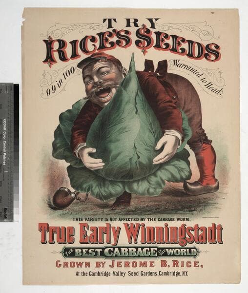 Image of a man wheeling a giant 90 lb. cabbage in a wheelbarrow on dirt road on the way to a county fair in an advertisement for Rice's Seeds of Cambridge, New York.