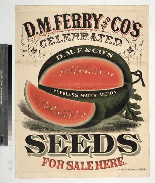 Image of a young child sitting on the floor and eating a cantaloupe melon off a plate with a spoon in an advertisement for seeds sold by D. M. Ferry & Company of Detroit, Michigan.