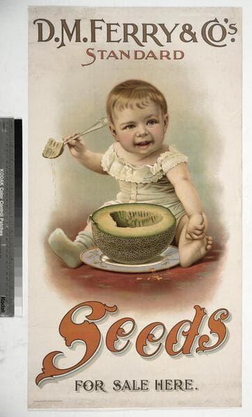 Image of a large watermelon on the vine with a slice cut out in an advertisement for seeds sold by D. M. Ferry & Company of Detroit, Michigan.
