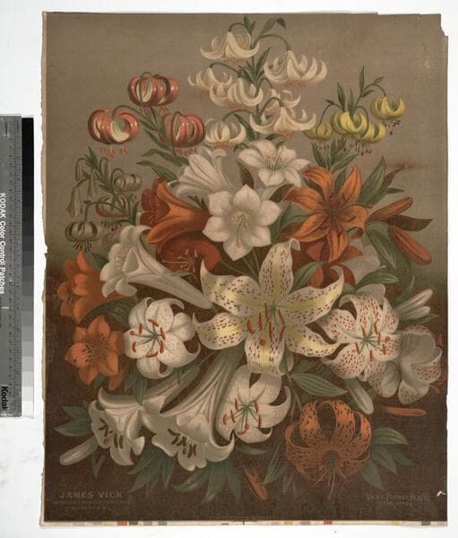 Image of a large bouquet of a variety of lilies in an urn advertising for Briggs and Brother seeds of Rochester, New York; flowers are numbered but there is no corresponding key with this print.