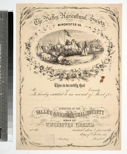 Image of a deer with antlers in an oval frame in the center of a certificate issued by the Worcester Agricultural Society of Massachusetts; farming implements on the ground in a field surrounding the deer; trees, farmhouse and barn in background; seal of the County of Worcester, Massachusetts, with cow in center at bottom left.