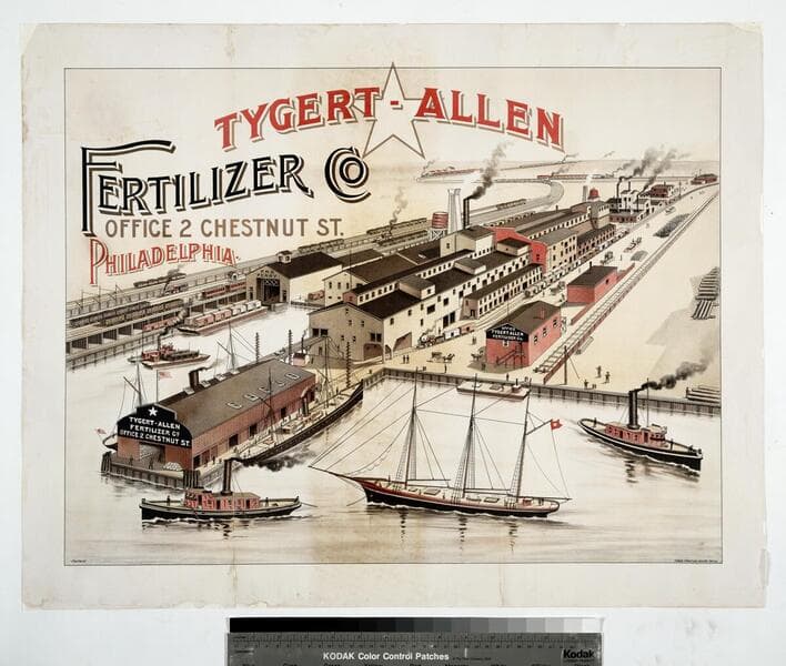 Image of an elevated view of the Fancy and Family Soap Works factory on the corner of Callowhill St. and Hamilton St. (SW corner) in Philadelphia, Pennsylvania; goods moving in and out in carriages and the town in the background behind the Schuylkill River.
