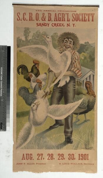 - Image of a boy grabbing geese with chickens and a turkey nearby on an advertisement for the 44th Annual Exhibition of the Sandy Creek, Richland, Orwell and Boylston Agricultural Society held in Sandy Creek, New York.