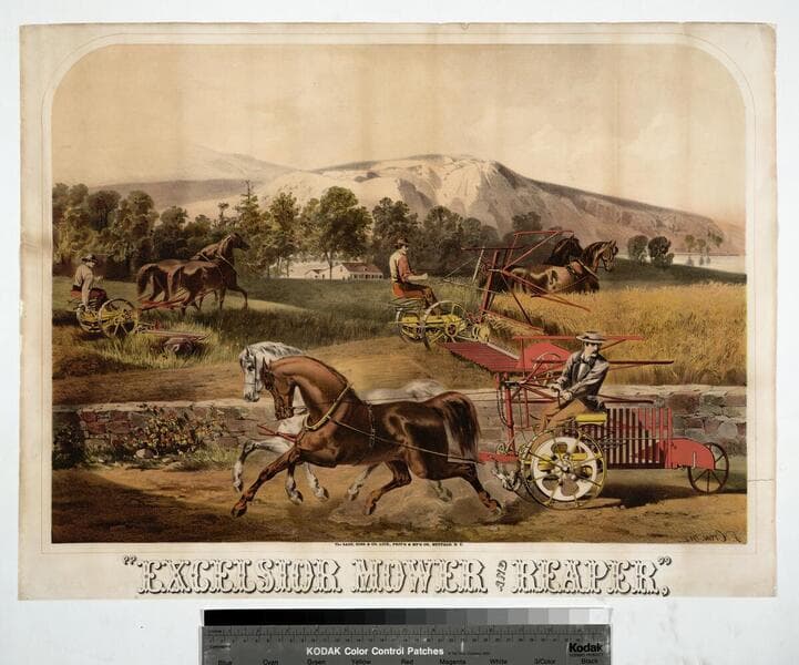 Image of an advertisement for Buckeye Mower & Reaper Company of Akron, Ohio; a man drives a team of horses down a dirt road past a deer in a forest and a pair of Native American Indians; harvest in progress on a farm with agricultural machinery, workers, and horses with farmhouse and lake landscape in background.