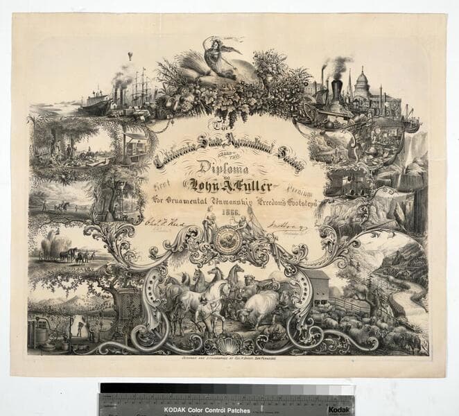 Image of a certificate from the California State Board of Agriculture with allegorical figures of women and cherubs forming a decorative border; men in robes with agricultural tools and plants flank an image of the California State Capitol in Sacramento, California, with flags and eagle at bottom center; farm fields, cabins, agricultural machinery, horses, livestock, and crops visible in background.