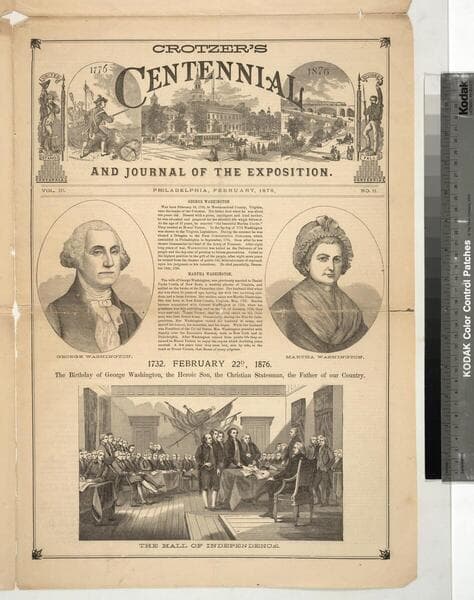 Image of the specialty newspaper Crotzer's Centennial, which contains coverage of the United States Centennial Exhibition held in Philadelphia, Pennsylvania, in 1876; contrasting vignettes of Revolutionary War soldiers in 1776 and a peaceful and prosperous landscape in 1876 at top center on page 1; images of the exhibition buildings in Fairmount Park throughout the newspaper; "fac simile of U.S. Centennial medals" on page 8.