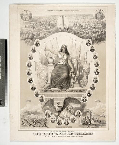 Image of the goddess Columbia seated with a laurel wreath in hand surrounded by American flags with an American eagle in the Union shield near her feet; portraits of the United States presidents from 1776-1876 and Revolutionary War generals curve around the central image of Columbia; an aerial view of the buildings for the United States Centennial Exhibition held in Philadelphia, Pennsylvania, in 1876 at top center with closer views of Independence Hall, the Bunker Hill Monument, and Faneuil Hall inset; contrasting vignettes of a Revolutionary War battlefield and a prosperous agrarian and industrial scene captioned "The Struggle for Liberty" and "Peace and Prosperity" at lower left and right.